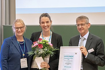 In der ausgezeichneten kumulativen Habilitationsschrift mit dem Titel „Versorgungsforschung bei pflegenden An-/Zugehörigen und nicht-pharmakologische Therapie bei Demenz“ befasste sich die Psychologin Dr. Anna Pendergrass in fünf international und national publizierten Arbeiten damit, wie die Lebensqualität von Menschen mit Demenz und ihren Zu- und Angehörigen im häuslichen Umfeld verbessert und die häusliche Pflege gestärkt werden können. Dabei verfolgte Dr. Pendergrass einen ganzheitlichen Ansatz zur Verbesserung der häuslichen Pflege und forschte an den drei wesentlichen Gruppen der Pflegesituation zu Hause: den Betroffenen, den Pflegenden und den Beratenden. Sie beleuchtete dabei neben einer Verringerung von Heimeinweisungen durch nicht-pharmakologische Interventionen sowie der Inanspruchnahme von Pflegeberatung auch erstmalig ein in Deutschland oft erlebtes, aber wenig erforschtes Konstrukt – die sogenannten Zugewinne durch die Pflege.