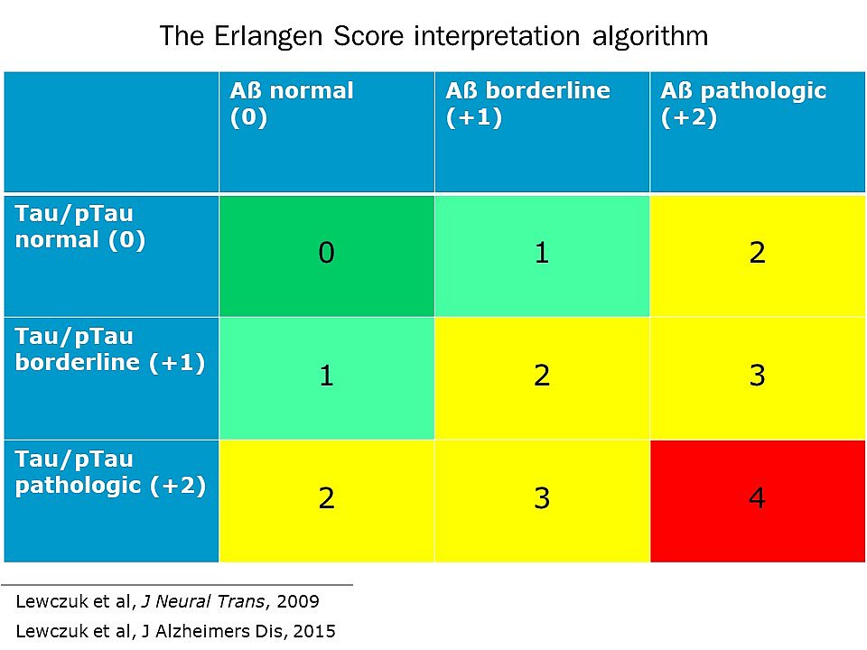 The Erlangen Score is the second major achievement of the group. This interpretation algorithm introduced in 2009 allows a classification of complex patterns of the NDD biomarkers into one-dimensional ordinal categories, spreading from “no evidence of neurodegeneration” to “neurochemically probable Alzheimer’s Disease”. This is particularly relevant for the evaluation of the progression probability at the Mild Cognitive Impairment (MCI) stage. The algorithm takes the borderline outcomes into consideration, which results from biological dynamics of the disease or imprecision of the laboratory method. Virtually all validation studies performed so far reconfirmed its utility for the interpretation of the CSF AD biomarkers. More on the algorithm, as well as on biomarkers of AD in general, you may find in an extended review here. Erlangen Score is easily programmable in laboratory software (like Swisslab®) for a fully automatic performance; let us know if you are interested in getting support.